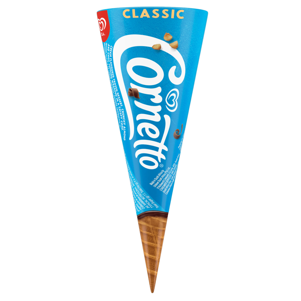 Cornetto é um gelado clássico que combina um delicioso gelado cremoso com uma bolacha crocante em forma de cone, finalizado com uma cobertura saborosa. A harmonia entre a textura suave do gelado e a crocância do cone proporciona uma experiência equilibrada e irresistível, tornando o Cornetto a escolha ideal para quem aprecia um gelado divertido, prático e cheio de sabor.